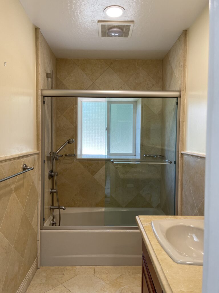 We also layered in some showstopping design elements, like a gorgeous green marble in the hall bath and the most perfect jewel box of a powder room, complete with fabulous glass mosaic tile and a floating vanity in this California ranch remodel.