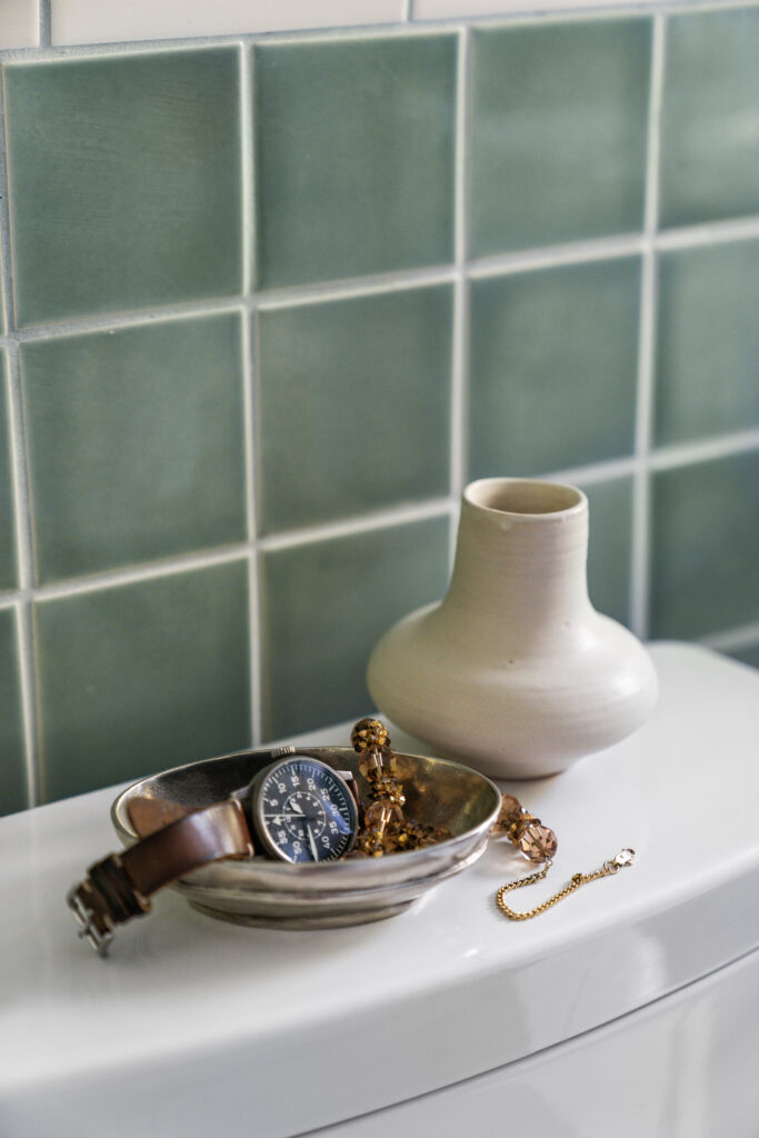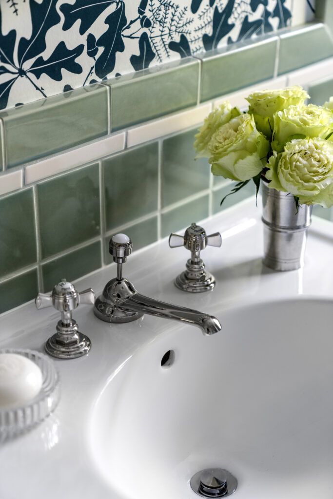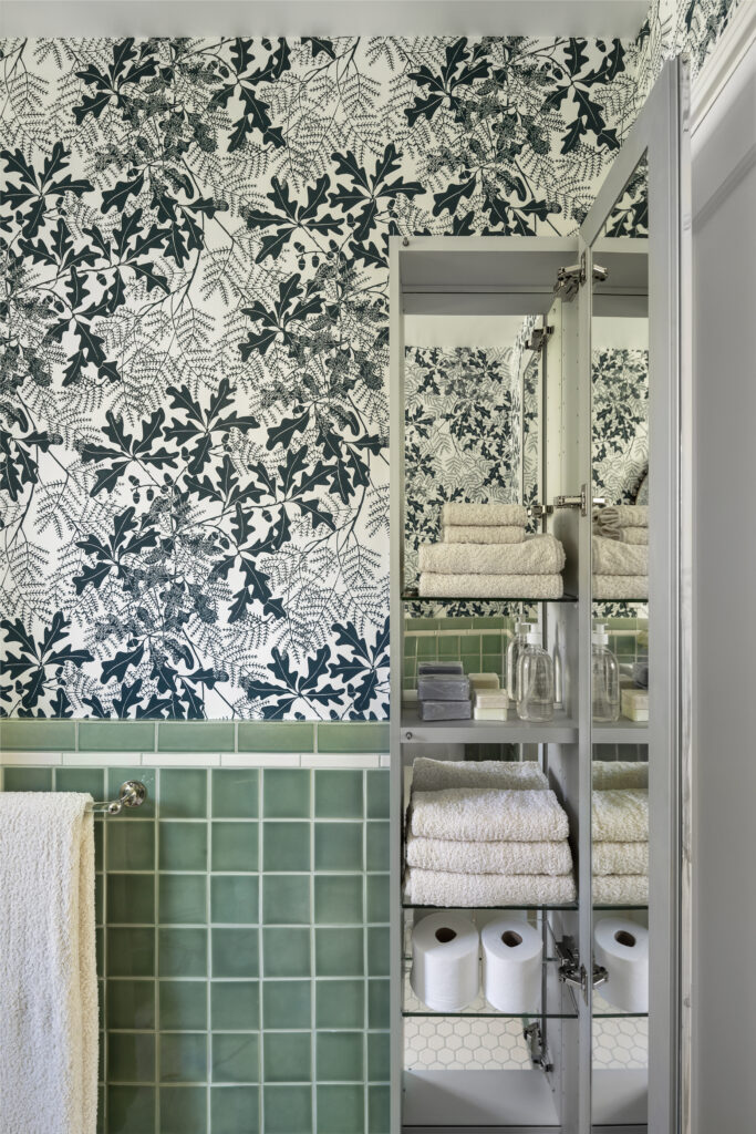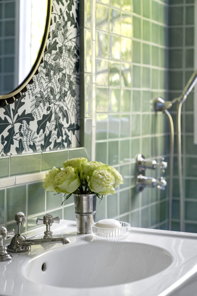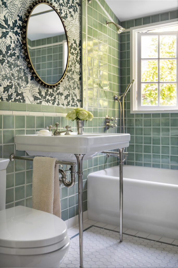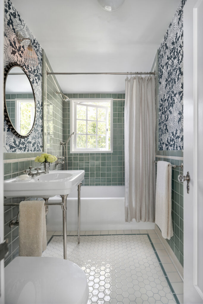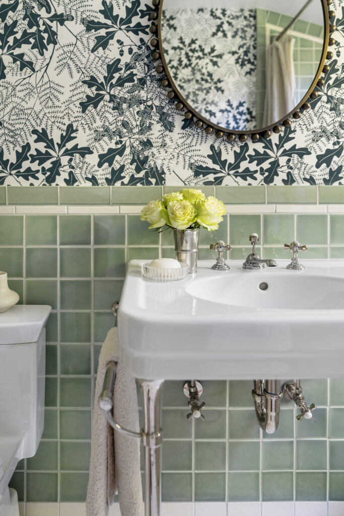 Once the demo was complete, we returned to the drawing board. We took inspiration from the home’s architecture, bathrooms true to the home’s era, and our clients’ desire for a peaceful, airy, and traditional space. We explored several options, including a moody art-deco jungle wallpaper and a soft sky-blue and earthy red tile with taupe-and-cream wallpaper. Ultimately, we chose a dreamy green-and-cream tile scheme paired with wallpaper by UK designer Marthe Armitage that balanced serenity with charm.