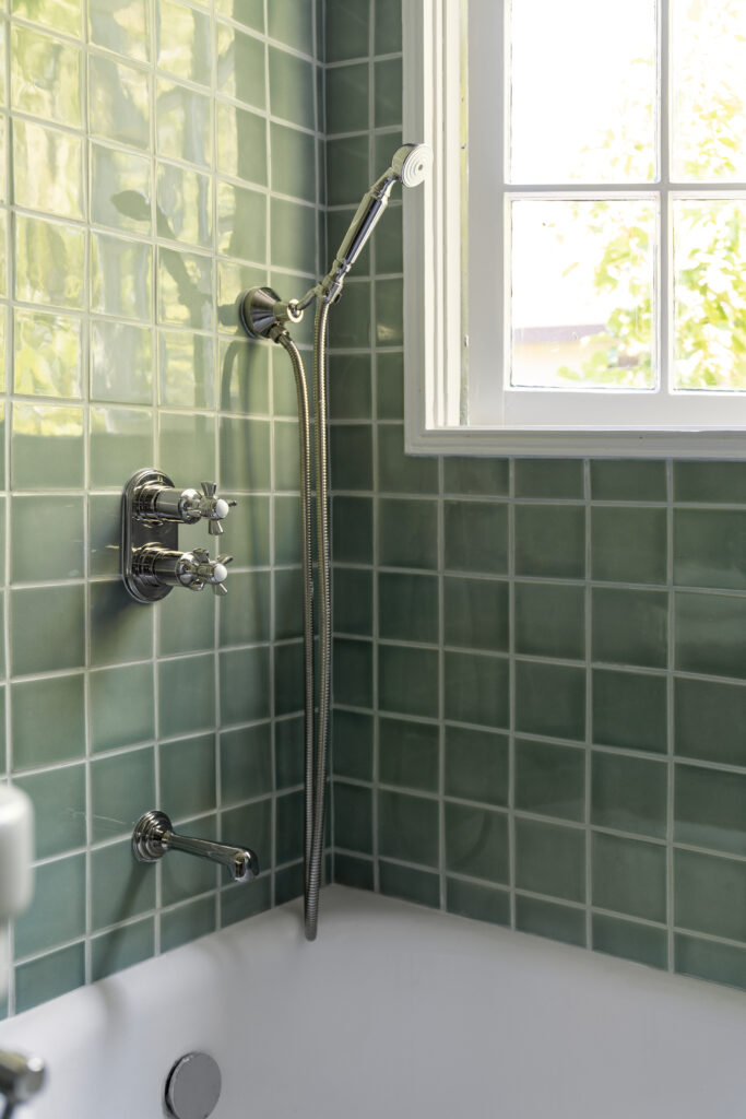 The layout was meticulously curated to incorporate era details for an accurate historic tile recreation, including a cream liner at the top of the wall tile, a reversed color palette on the floor, and careful attention to proportions so the space felt true to the home.