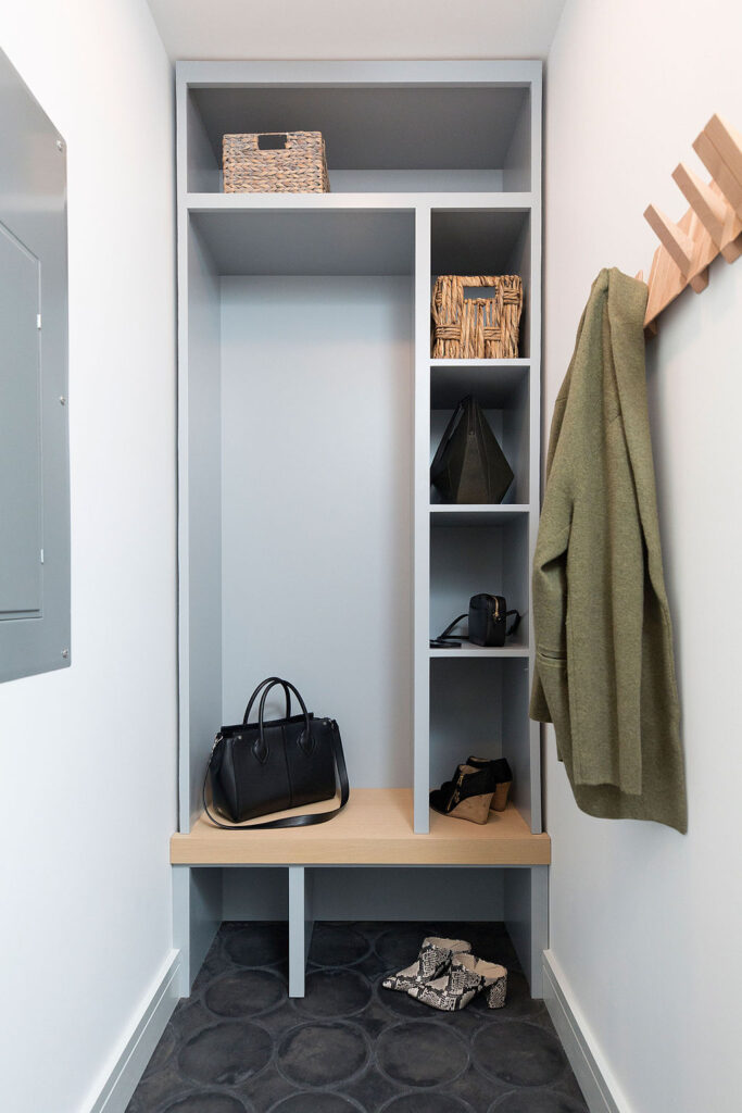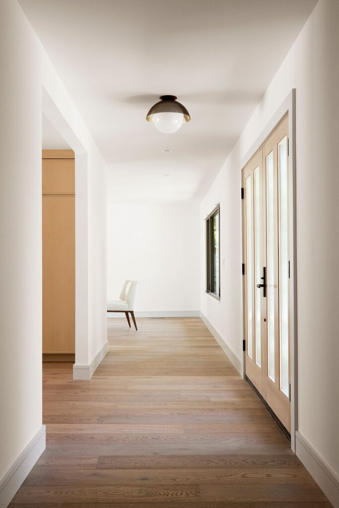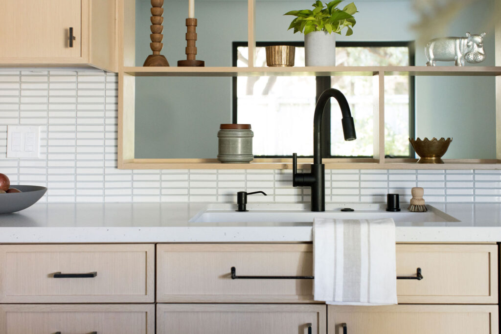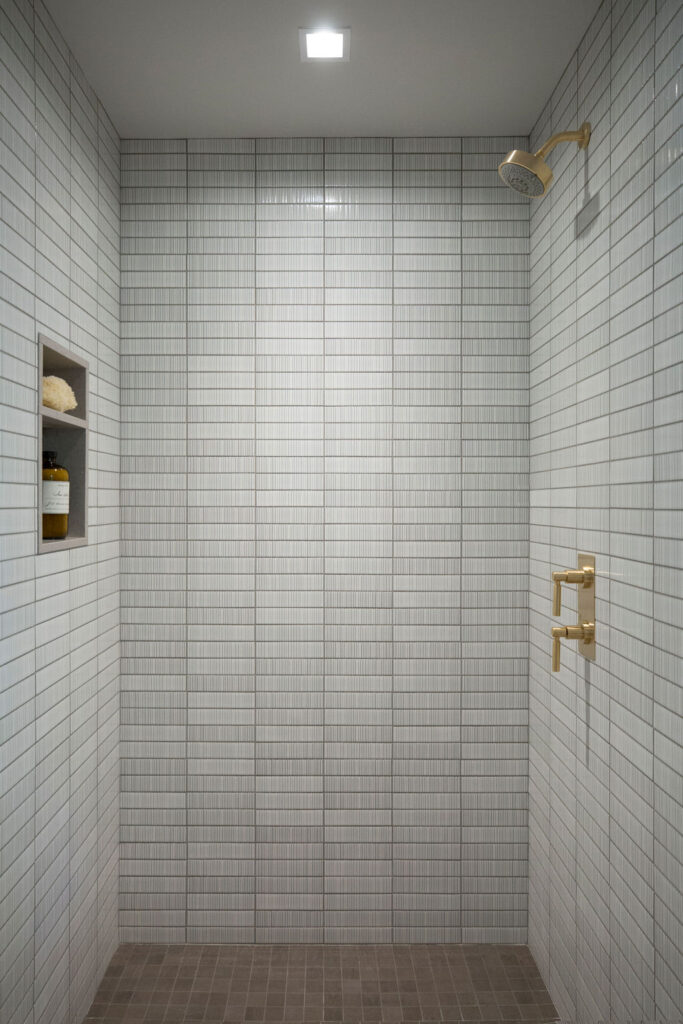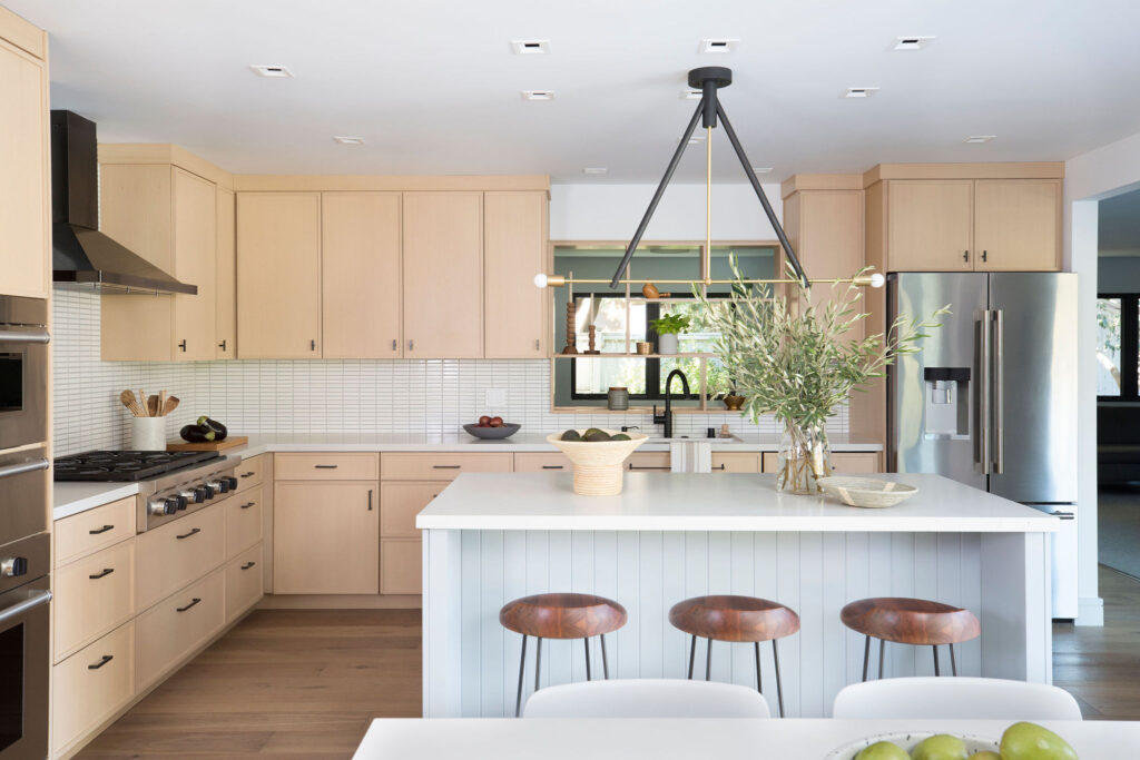 Beginning in the kitchen, we needed to create a space that is suitable for both serious cooking and hosting. We chose cabinets made from white oak to ensure they can take a hit. As the years roll past and these beauties are slammed shut, flung with backpacks, and experience the occasional collision, they will never show a dent. They will still look as beautiful ten years from now as the day they were installed. We then custom-designed the pantry with recessed doors to make mornings easier and to easily tuck away cereal, coffee, and other breakfast items for the rest of the day. We chose quartz countertops paired with ceramic tiles that stand up to the rigors of meal preparation and also look gorgeous while hosting.