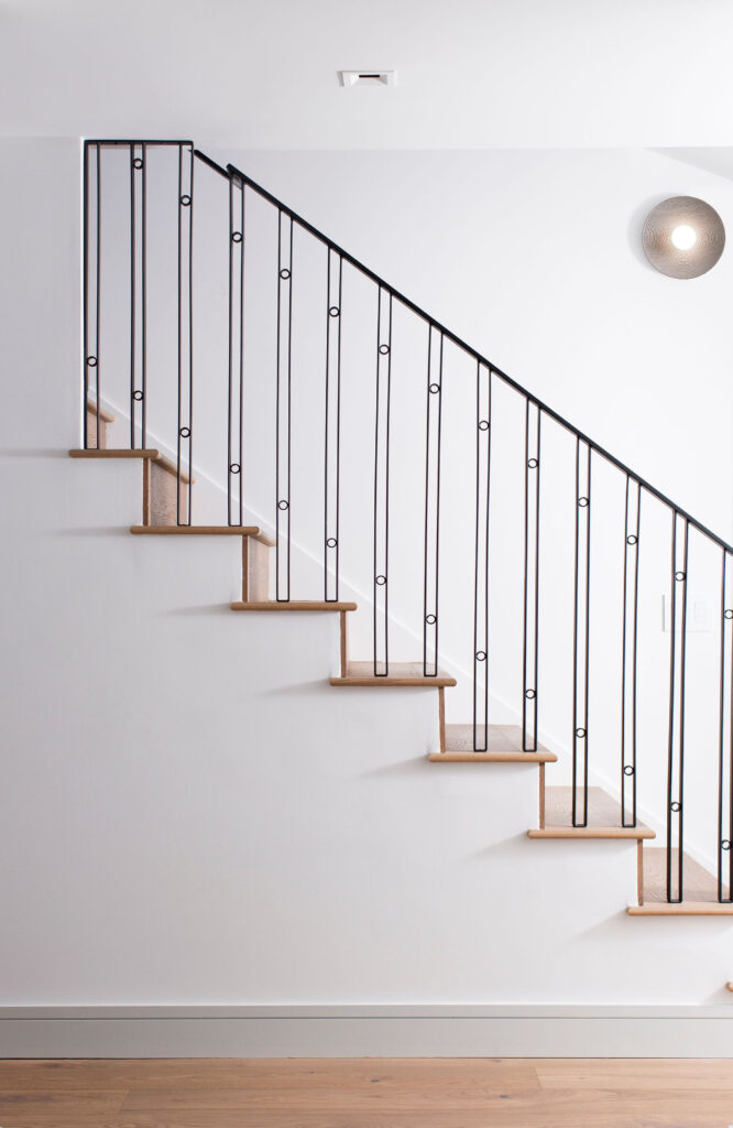 In addition to the fun tile, lighting also served as art that elevated the aesthetic of each space. We customized the stunning dining light fixture in a special size to ensure it would fit the space perfectly. Two other custom pieces were the stair railing and the front door, both of which were designed by MMID. We ensured that these functional, foundational elements were also visually stunning, adding to the home’s design and setting it apart from the status quo.