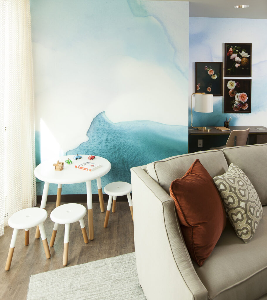 We made sure guests had everything they would need, from fun wallpaper that encourages play to cozy seats perfect for cuddling and functional furniture that makes it easy to tackle life’s everyday tasks. We also included a bookshelf with diverse books, so everyone could truly feel seen in the pages. Every element was layered with fun details to allow guests to discover something new, even on extended stays.